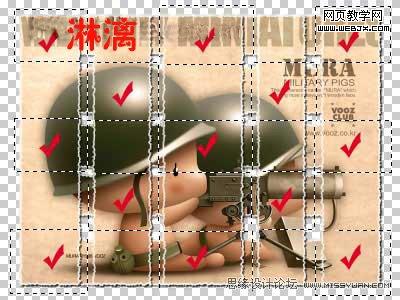 如果你曾經做過編織工作,那么你該很清楚其中的規律,經線和緯線互相交錯,依次顯示。在圖層2副本中,用矩形選框選取不要的部分,刪除。注意要按規律。矩形選框可以隨意些,只要能包括要刪除的部分而不致影響下一塊就可以了。這里,我們提供了一張圖,其中打紅色對勾的都是要刪除的對象,你也可以按照相反的位置來刪除。