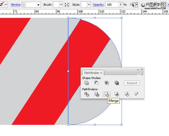 17、選擇半個圓圈,刪除其填充,按住Shift點擊它后面的矩形。現在,右鍵單擊>建立剪貼蒙版。在路徑查找器窗口(窗口>路徑查找器),單擊合并按鈕。