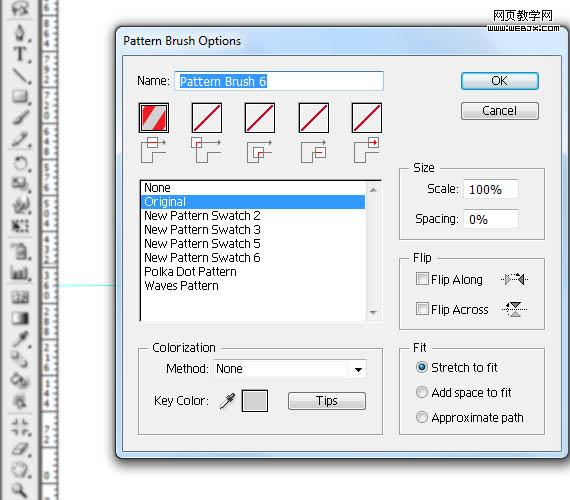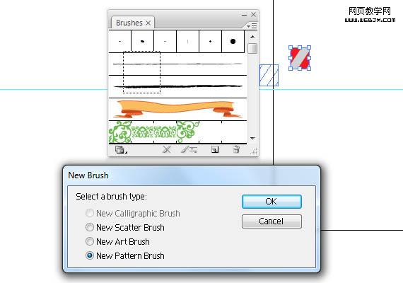 12、選擇所有藝術品,點擊拖動它到畫筆面板(F7鍵),設置它為“圖案畫筆”。使用路徑工具(P)繪制一條長的筆直路徑。然后點擊你剛才創建的畫筆。