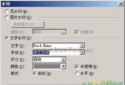 第2步,打開(kāi)“水印”對(duì)話框,選中“文字水印”單選按鈕。在“文字”文本框中可以選擇Word2003自帶的文字內(nèi)容(例如“公司絕密”、“傳閱”、 “樣本”等),也可以根據(jù)需要輸入文字。 在“字體”和“尺寸”編輯框中分別選擇水印文字的字體和尺寸,并設(shè)置水印文字的顏色(建議設(shè)置為灰色)。然后選中 “半透明”復(fù)選框,并根據(jù)需要在“版式”區(qū)域選中“斜式”或“水平”單選按鈕。設(shè)置完畢單擊“應(yīng)用”按鈕查看效果,確定效果合適后單擊“關(guān)閉”按鈕即可,如圖2010060902所示。