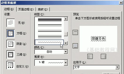 在中間的“線型”里找到波浪線選中,然后右邊的預(yù)覽窗口中出現(xiàn)添加邊框的效果,單擊確定完成設(shè)置;