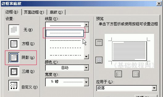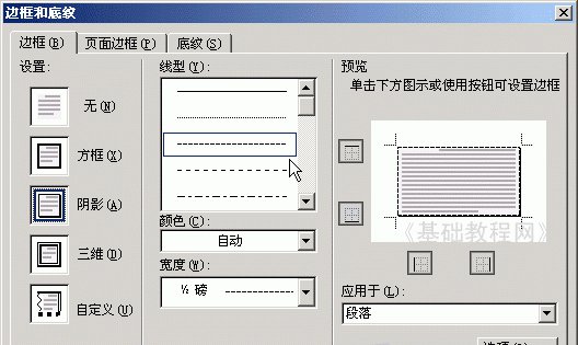 在出來的對話框中,在左邊選擇“陰影”、在中間選擇較寬的虛線,看一下右邊的預(yù)覽效果,點“確定”完成;