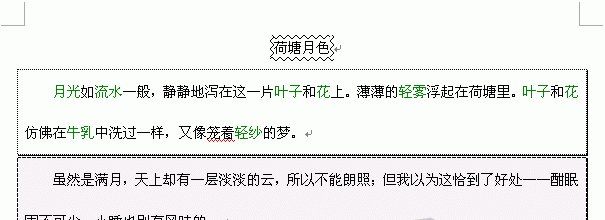 1)選中標(biāo)題“荷塘月色”文字部分,后面的拐彎箭頭別選,單擊菜單“格式-邊框和底紋”,出來一個對話框;