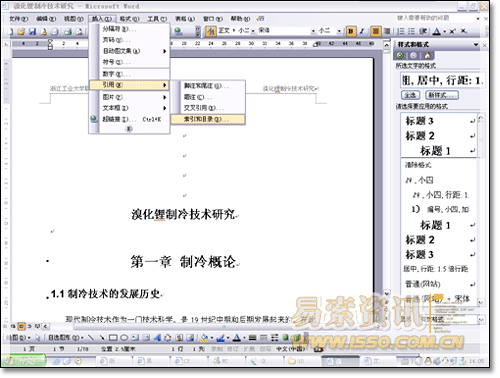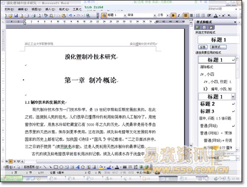 4.用標題1,2,3分別去定義文中的每一章節。定義時很方便,只要把光標點到“第一章 制冷概論”上,然后用鼠標左鍵點一下右邊的標題1,就定義好了;同樣方法用標題2,3定義1.1;1.1.1;依此類推,第二章,第三章也這樣定義,直到全文節尾。