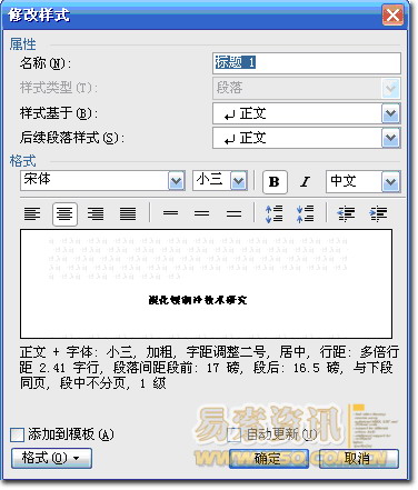 3.當然標題1,標題2,標題3的屬性(如字體大小,居中,加粗,等等)可以自行修改的。修改方法:右鍵點擊“標題1”選“修改”,會彈出修改菜單,您可以根據自己的要求自行修改。