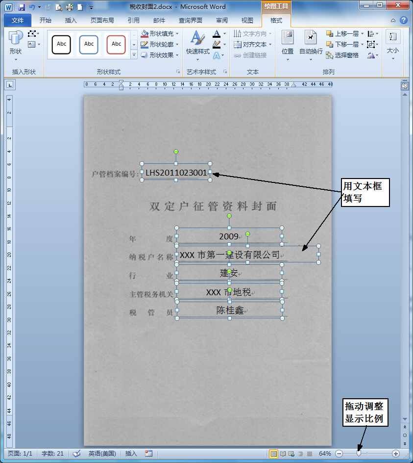 接下來(lái)是插入文本框進(jìn)行填寫。切換到“插入”選項(xiàng)卡,單擊“文本框”選擇“繪制文本框”,在“戶管檔案編號(hào)”后面的橫線上拖畫出一個(gè)文本框。在“格式”選項(xiàng)卡中設(shè)置為“無(wú)填充顏色”、“無(wú)邊框”,在文本框中輸入編號(hào)并設(shè)置合適的字體即可。然后把這個(gè)文本框復(fù)制粘貼到各條橫線上,適當(dāng)調(diào)整長(zhǎng)度,再輸入各項(xiàng)內(nèi)容就行了(如圖3)。