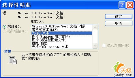 第四步,執行“編輯”→“選擇性粘貼”,打開“選擇性粘貼”對話框,選擇粘貼形式為“無格式文本”,如圖4。