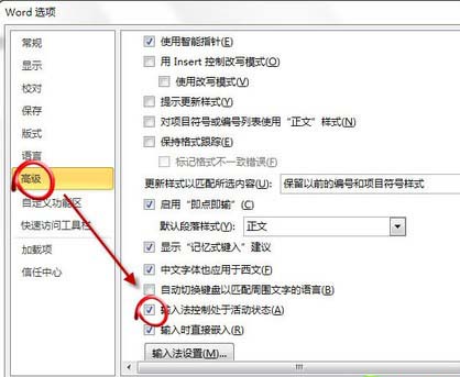在“選項”窗口,單擊“高級”,然后從右側(cè)細節(jié)窗口找到“輸入法控制處于活動狀態(tài)”,將其勾選。