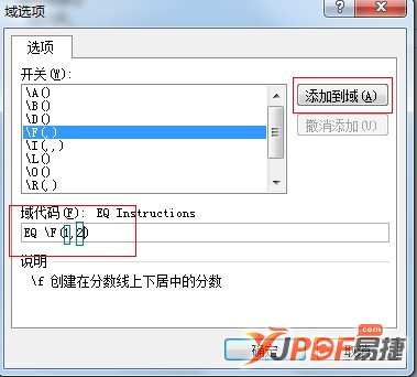 第三步:點擊“添加到域”,然后域代碼處,填寫分子和分母的數值,如下圖,數字“1”的位置是分子,數字“2”的位置是分母。