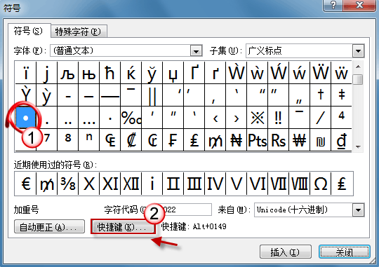 另外,注意到沒有,當選中某個符號時,“符號”窗口下方會給出一個快捷鍵提示。例如,當選中圓點時,快捷鍵顯示為 Alt+0149。下次您可以直接使用這組快捷鍵來輸入圓點。