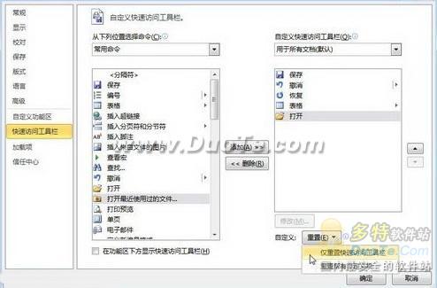 第3步,重復(fù)步驟2可以向Word2010快速訪問工具欄添加多個命令,依次單擊“重置”→“僅重置快速訪問工具欄”按鈕將“快速訪問工具欄”恢復(fù)到原始狀態(tài),如圖2009121303所示。