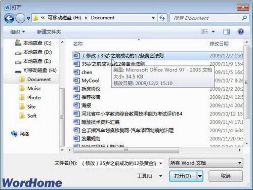 雖然在Word2010文檔窗口“最近”面板中可以打開最近使用過的Word文檔,但如果該列表中沒有找到想要打開的Word文檔,用戶可以在“打開”對話框中打開任何一個Word文檔,操作步驟如下所述: