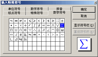 然后,像上圖一樣,點擊往右向左數的第一行第三個按鈕,可彈出如上圖的列表,其中,西格碼符號∑就在里面,使用鼠標左鍵點擊就可以自動輸入了。