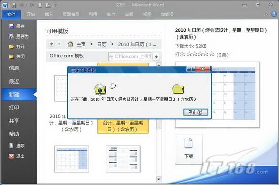 第三步:打開“2010年日歷”模板后,窗口中列出五種2010年日歷模板供大家選擇使用,用鼠標(biāo)選中任意一種模板,窗口右側(cè)會顯示該模板的效果預(yù)覽(如圖3),找到自己喜歡的模板,單擊“下載”按鈕,系統(tǒng)開始從官方網(wǎng)站下載日歷模板(如圖4)。