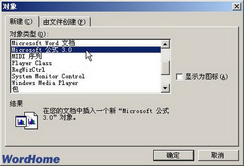 第2步,在打開的“對象”對話框中,切換到“新建”選項卡。在“對象類型”列表中選中“Microsoft 公式 3.0”選項,并單擊“確定”按鈕,如圖2009012206所示。