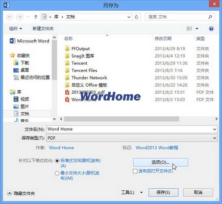 第2步,打開“另存為”選項卡,選擇Word轉PDF生成文件的保存位置。在打開的“另存為”對話框中選擇“保存類型”為PDF,然后單擊“選項”按鈕,如圖2所示。