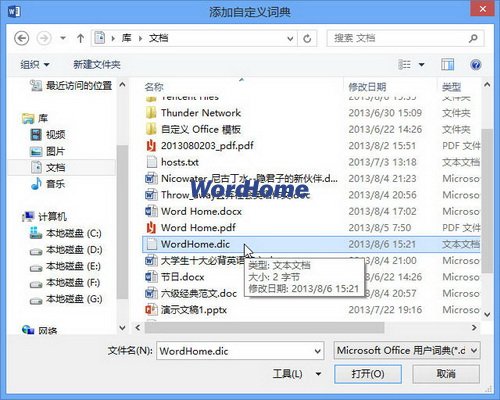 第4步,在打開的“添加自定義詞典”對話框中查找并選中自定義詞典,然后單擊“打開”按鈕,如圖4所示。