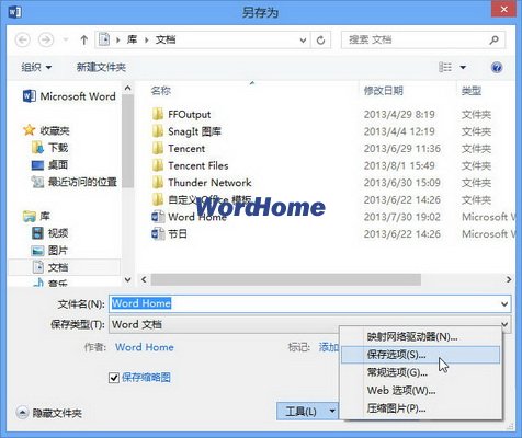 第2步,在打開的“另存為”對(duì)話框中單擊“工具”按鈕,并在打開的菜單中選擇“保存選項(xiàng)”命令。