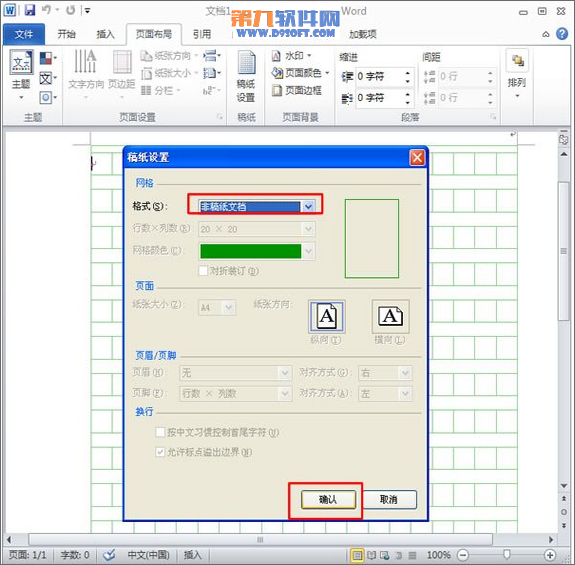 4、如果想刪除稿紙樣式怎么辦呢?單擊“頁面布局”-“稿紙”-“稿紙設置”按鈕,在彈出的“稿紙設置”對話框中,在“格式”的下拉框中選擇“非稿紙文檔”選項,單擊“確認”按鈕即可將文檔中的稿紙樣式刪除。