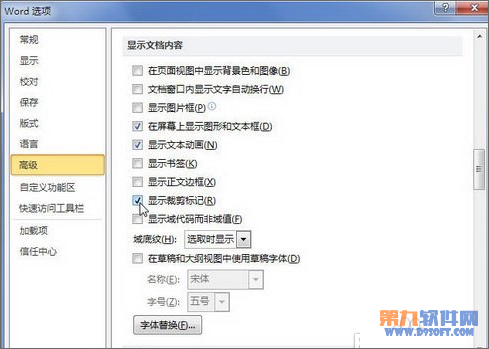 第2步,打開(kāi)“Word選項(xiàng)”對(duì)話框,切換到“高級(jí)”選項(xiàng)卡。在“顯示文檔內(nèi)容”區(qū)域取消或選中“顯示裁剪標(biāo)記”復(fù)選框,并單擊“確定”按鈕,即可在Word文檔頁(yè)面隱藏或顯示裁剪標(biāo)記,如圖2所示。