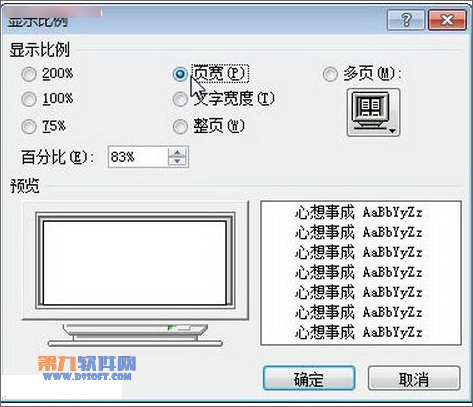 2、在打開(kāi)的“顯示比例”對(duì)話框中,用戶既可以通過(guò)選擇預(yù)置的顯示比例(如75%、頁(yè)寬)設(shè)置Word2010頁(yè)面顯示比例,也可以微調(diào)百分比數(shù)值調(diào)整頁(yè)面顯示比例