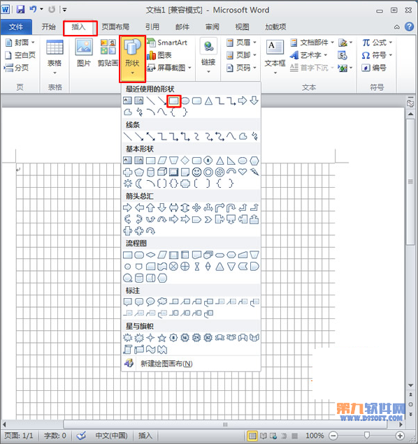 4、網格就設置完成了,現在測試一下效果,在文檔中插入幾個形狀。單擊“插入”-“插圖”-“形狀”按鈕,在彈出的下拉框中選擇需要的形狀。