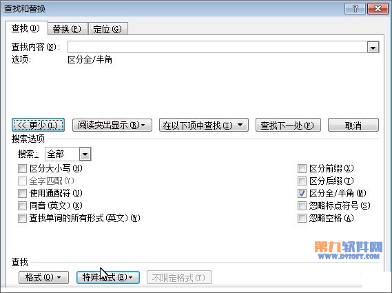 ?、畚覀兛梢钥吹礁喙δ?,單擊查找中的特殊格式按鈕。