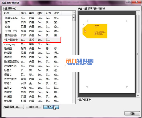 6、彈出構建基塊管理器對話框,選擇客戶聯系卡,插入。