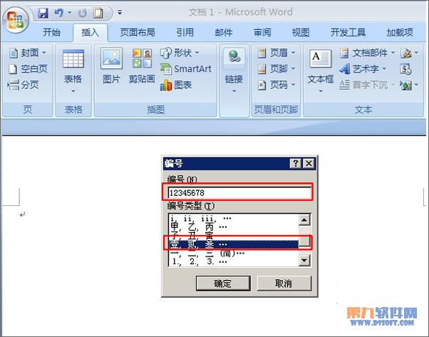 2、彈出“編號”對話框,在“編號”文檔框中輸入我們需要轉換成中文大寫金額的阿拉伯數字金額,在“編號類型”文本框中選擇“壹,貳,叁…”,點擊“確定”即可。