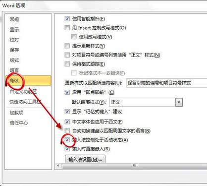 在“選項”窗口,單擊“高級”,然后從右側(cè)細節(jié)窗口找到“輸入法控制處于活動狀態(tài)”,將其勾選。