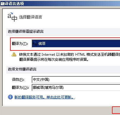 4、此時窗口會彈出一個“翻譯語言選項”的對話框,在“翻譯為”后面的倒三角的下拉按鈕下選擇自己需要翻譯的語言,例如“俄語”,然后點擊確定;