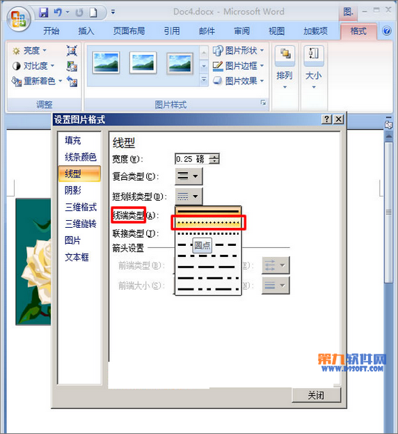 2.在彈出對話框的【線型】選項卡中,設置線端類型為【圓點】。