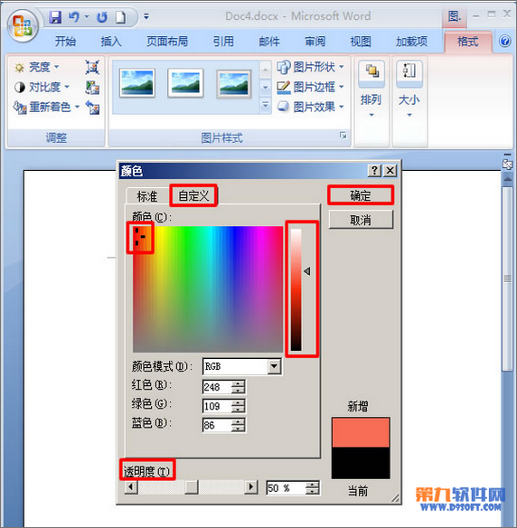 5.在彈出的對話框中切換到【自定義】選項卡,設置好顏色及顏色深淺和透明度,設置完畢后單擊【確定】。