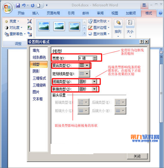3.在【線型】選項卡中,設定【寬度】為【8磅】,【復合類型】為【由細到粗】。【線端類型】和【聯接類型】設為【圓形】,設置完畢后單擊【關閉】。