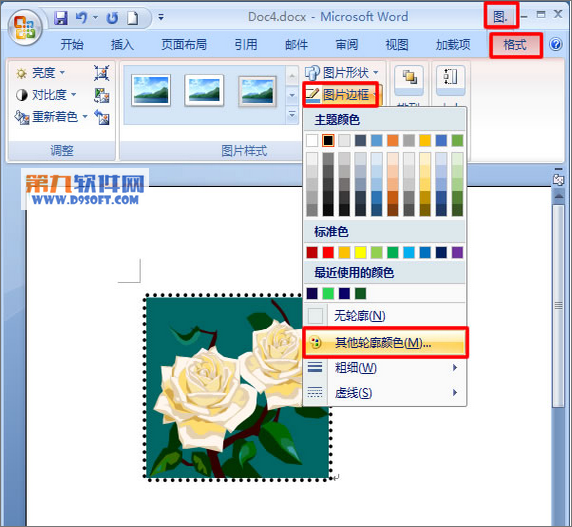 4.設置邊框顏色。仍在【圖片工具】—【格式】選項卡的【圖片樣式】功能單中,單擊【圖片邊框】,在彈出的下拉列表中點擊【其他輪廓顏色】。
