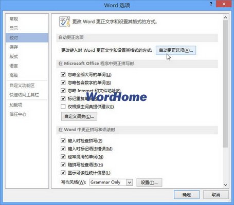 第2步,在打開的“Word選項”對話框中切換到“校對”選項卡,在“自動更正選項”區(qū)域單擊“自動更正選項”按鈕,如圖2所示。