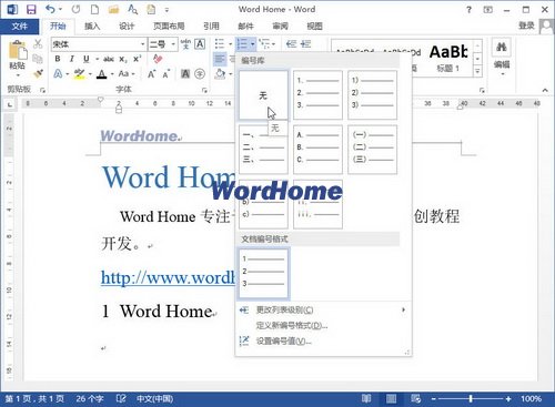 第4步,返回Word2013文檔窗口,在文檔中輸入任意數字(例如輸入阿拉伯數字1),然后按下Tab鍵。接著輸入具體的文本內容,按下回車鍵自動生成編號。連續(xù)按下兩次回車鍵將取消編號狀態(tài),或者在“開始”功能區(qū)的“段落”分組中單擊“編號”下拉三角按鈕,在打開的編號列表中選擇“無”選項取消自動編號狀態(tài),如圖4所示。
