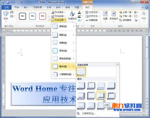 第3步,打開形狀效果菜單,指向“棱臺”選項。在棱臺列表中,將鼠標指向任意一種棱臺效果,則Word2010文檔中的藝術字將實時顯示最終效果。確認使用該棱臺效果后單擊該效果即可