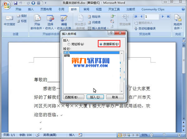 4、插入合并域,勾選數據庫域,選擇姓名,插入。