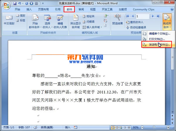 1、啟動Word2007,打開我先前制作好的通知文件,單擊菜單欄--郵件--選擇收件人--使用現有列表。