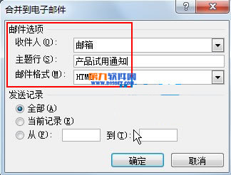 6、最后,我們合并到電子郵件中,輸入收件人,主題行個郵件格式,格式我們選擇html,發送到全部,確定。
