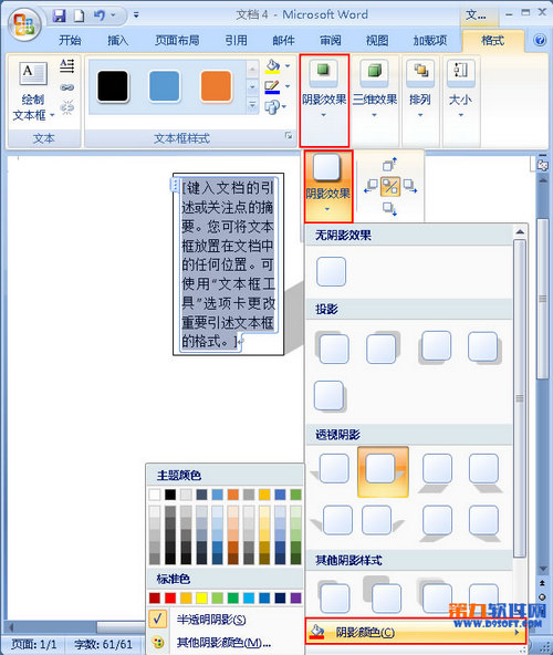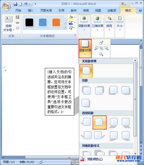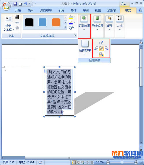 1、打開Word2007,在文檔中插入一個文本框,單擊選中文本框,在“格式”的下拉菜單中,選擇“陰影效果”選項。