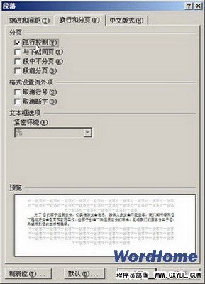 第2步,在打開的Word 2007“段落”對話框中切換到“換行和分頁”選項卡,在“分頁”區域含有4個與分頁有關的選項,每項的功能如下:
