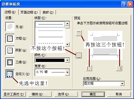 6、再次選中文本框(此時(shí)應(yīng)該是圖文框了),執(zhí)行“格式→邊框和底紋”命令,打開“邊框和底紋”對(duì)話框(如圖3),在“邊框”標(biāo)簽中,先選中“設(shè)置”下面的“自定義”選項(xiàng),再按預(yù)覽區(qū)域中的三個(gè)邊框設(shè)置按鈕各一次(只保留一個(gè)不按,如圖3),“確定”退出。