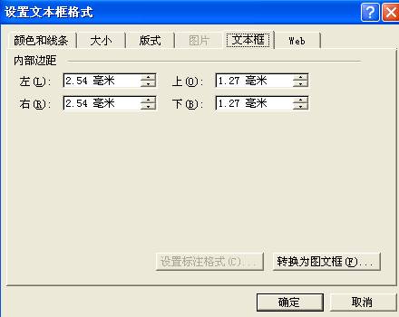 5、選中文本框,執(zhí)行“格式→文本框”命令,打開“設(shè)置文本框格式”對(duì)話框(如圖2),在“文本框”標(biāo)簽中按“轉(zhuǎn)換為圖文框”按鈕(此步關(guān)鍵),在隨后彈出的對(duì)話框中直接按“確定”按鈕。