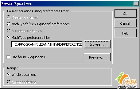 然后在打開的“Format Equations”對話框中選中中間的“MathType preference file”單選項,并點擊“Browse”按鈕,找到我們保存好的那個eqp文件并雙擊。然后再選中下方“Range”項目中“Whole document”單選項,如圖5所示。點擊“OK”按鈕后稍候片刻,就可以看到所有的公式都按指定的字號調(diào)整完成了。