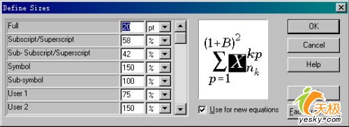 打開“Define Sizes”對話框,我們可以在“Full”后的輸入框中要調(diào)整的字號大小,如圖2所示。公式中其它的元素會自動進行相應的調(diào)整的,所以一般情況下可以不做其它改動。點擊“OK”按鈕,關閉對話框。
