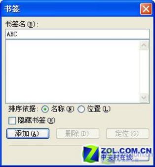 打開“插入”菜單, 選擇“書簽”選項, 彈出“書簽”對話框, 在“書簽名”欄中任意給書簽取個名字, 就叫“ABC”吧!(如圖5)所示。