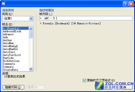 單擊“添加”按鈕, 對話框隨即會關閉。 將光標移到頁腳的另一側, 可以使用空格鍵將光標位置調整好, 打開“插入”菜單, 選擇“域”選項, 彈出“域”對話框, 單擊“域代碼”按鈕, 在“域代碼”輸入框中輸入“ABC-5”, (如圖6)所示。