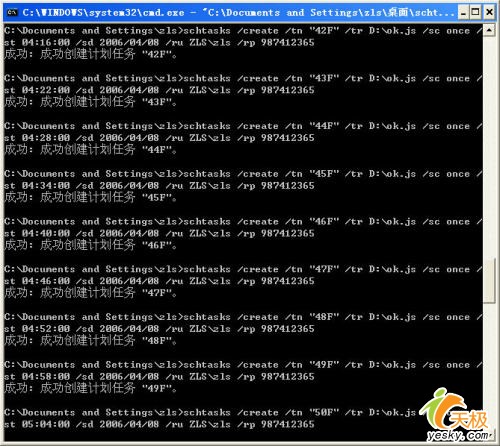 按照說明,結合實際,先嘗試寫了一個范例:schtasks /create /tn “1F” /tr D:ok.js /sc once /st 00:10:00 /sd 2006/04/08 /ru ZLSzls /rp 987412365。分析一下,批量添加計劃任務,其中發生變化的分別是計劃任務名稱、開始時間兩個參數。其中前者可以為任意名稱,后者根據實際需要,可以設置為間隔一(段)定時間,看來結合Excel與Word可以迅速編寫出批量添加計劃任務的命令行文本。
